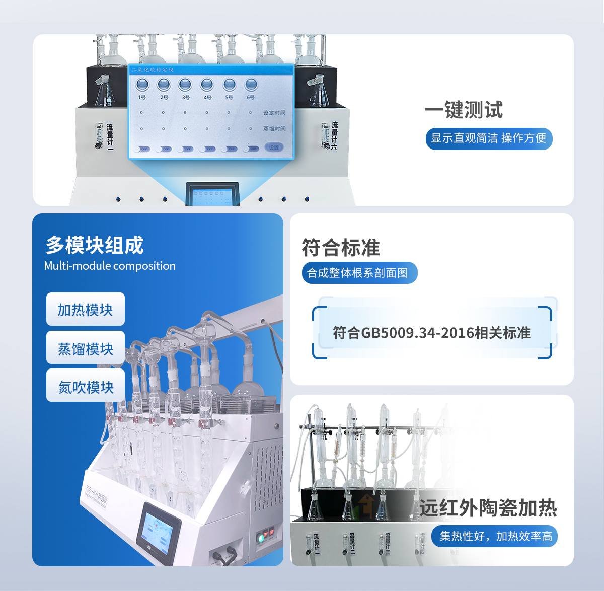中藥二氧化硫殘留量測定儀主要由加熱模塊,蒸餾模塊,氮吹模塊組成。加熱模塊設置了高,中,低三檔加熱速率控制功能,可實現加熱效率的**控制面板;蒸餾模塊選用高硼硅材料,耐熱性好,堅固耐用;。氮吹模塊可外接氮氣發生器或氮氣鋼瓶,并配有高精度氣體流量計,嚴格控制氮吹速率