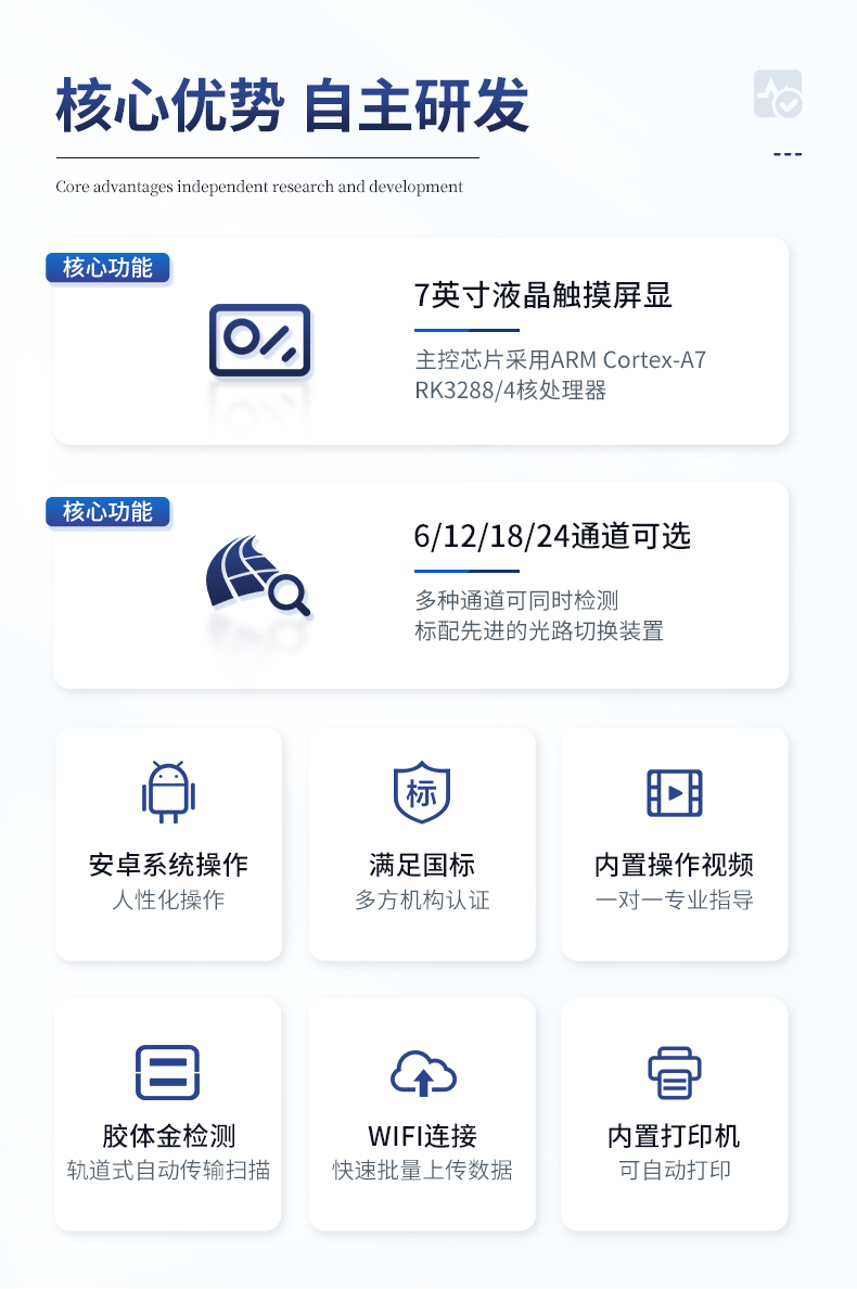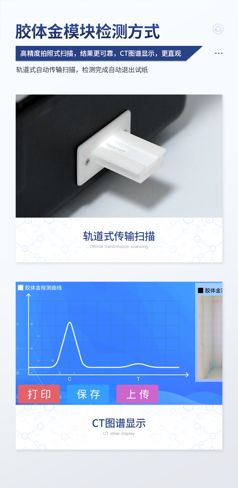 6、膠體金模塊檢測方式:軌道式自動(dòng)傳輸掃描,檢測完成后自動(dòng)退出檢測卡。