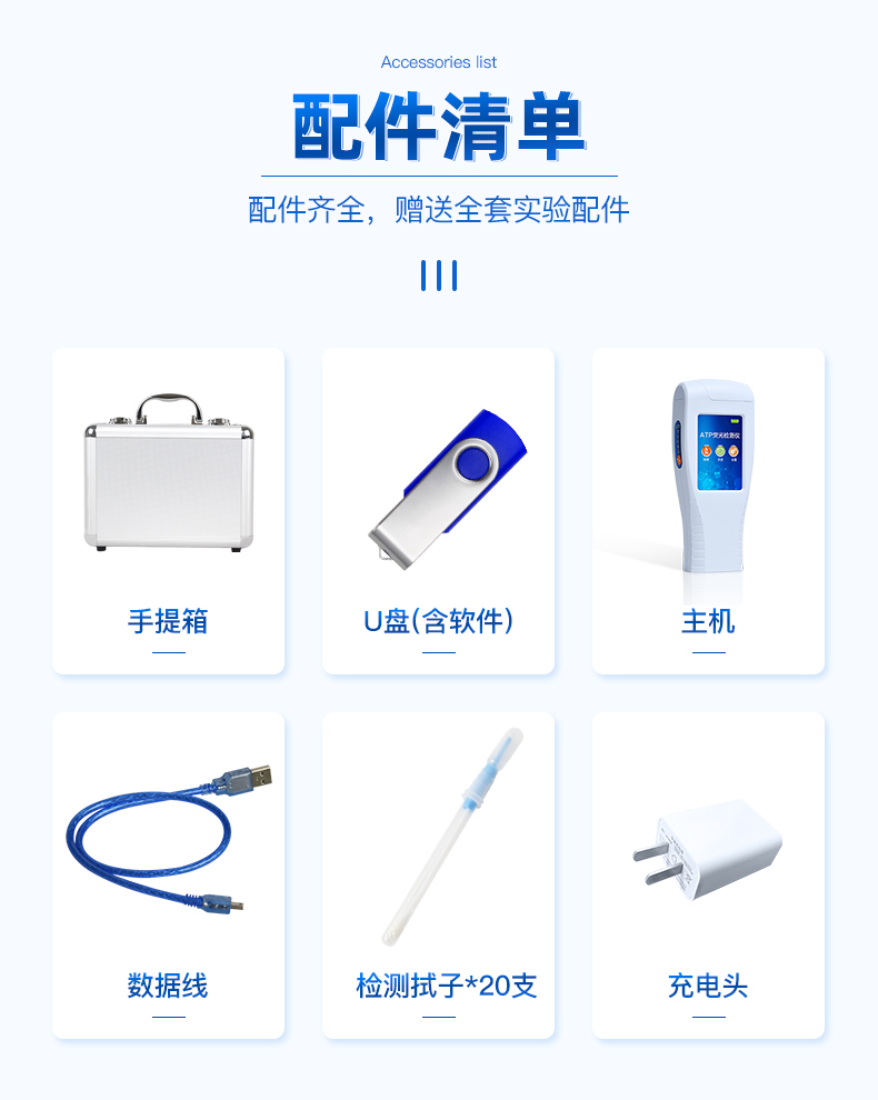 隨機配置:菌落總數檢測儀(手持)主機、鋁合金手提箱、驅動U盤、儀器包、掛繩、PC數據線、數據分析軟件、中文操作手冊。