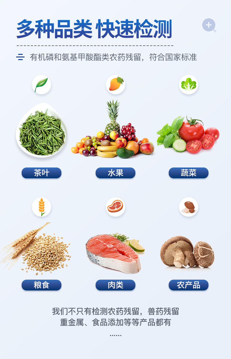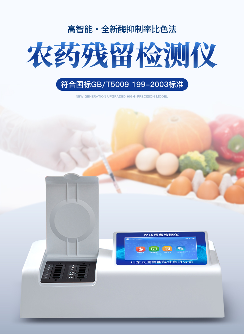 檢測標(biāo)準(zhǔn):依據(jù)國家標(biāo)準(zhǔn)方法(GB/T5009.199-2003)以及世界衛(wèi)生組織WHO、世界糧農(nóng)組織FAO殘留農(nóng)藥檢測標(biāo)準(zhǔn)、世界環(huán)境保護(hù)局EPA參照攝入量等要求來設(shè)計。采用酶抑制率比色法對水果、蔬菜等農(nóng)林產(chǎn)品中有機(jī)磷和氨基甲酸酯類農(nóng)藥含量進(jìn)行快速準(zhǔn)確的檢測。