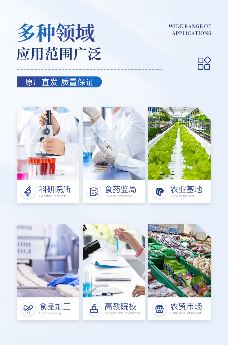 廣泛應(yīng)用于主要用于蔬菜、水果、茶葉、糧食、農(nóng)副產(chǎn)品等食品中有機磷和氨基甲酸酯類農(nóng)藥殘留的快速檢測;此外還可用于果蔬茶生產(chǎn)基地和農(nóng)貿(mào)批發(fā)銷售市場現(xiàn)場檢測,餐館、學(xué)校、食堂、家庭果蔬加工前的安全速測等。
