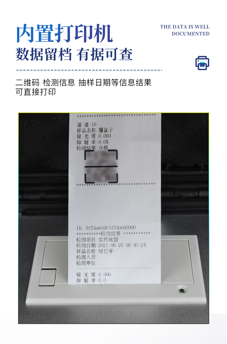 8、打印機采用串口5v打印,可選擇手動打印或者自動打印,三分鐘出打印結(jié)果,打印格式為檢測人姓名、吸光度差值、檢測時間、檢測機構(gòu)、樣品名稱及結(jié)果判定。