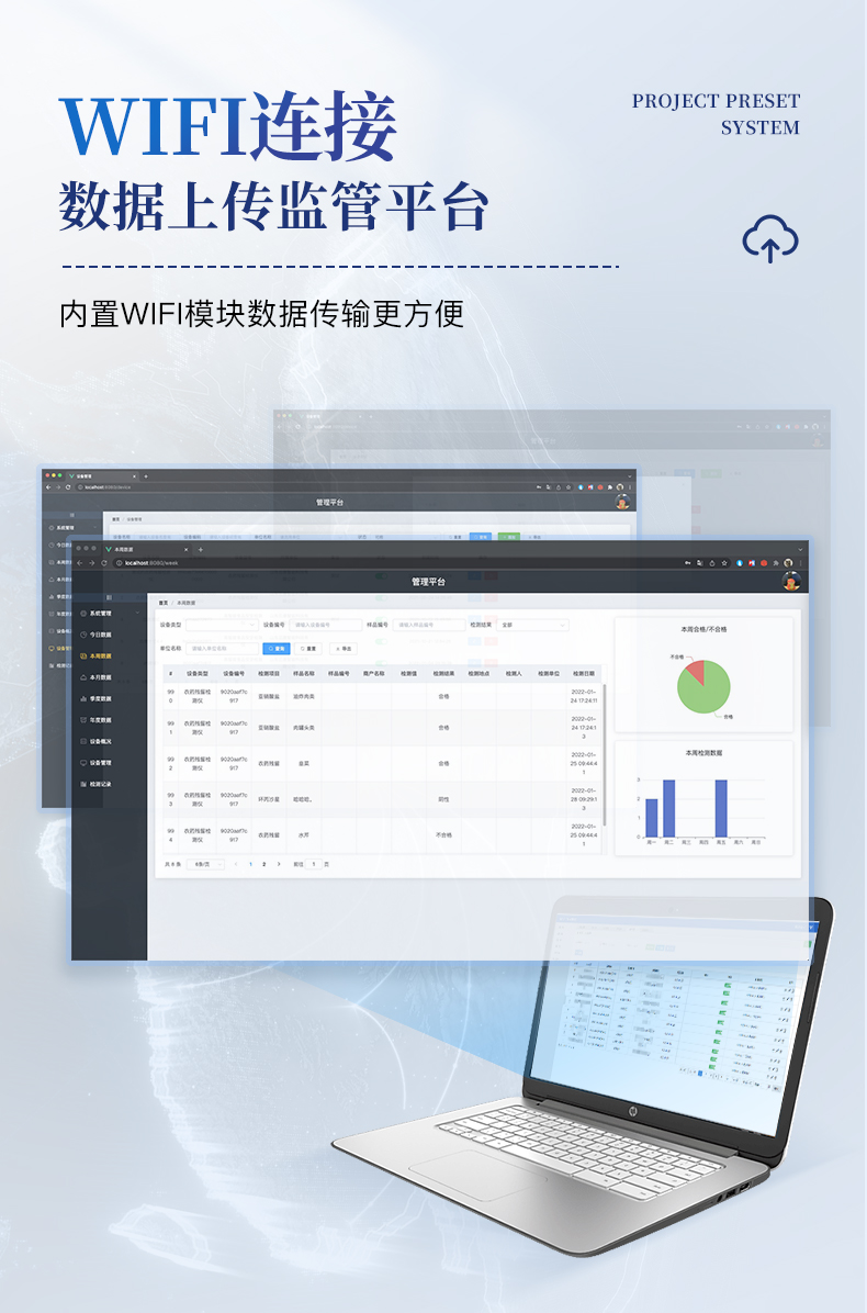 6、儀器具有wifi聯(lián)網(wǎng)功能,可將數(shù)據(jù)快速上傳電腦,進(jìn)行數(shù)據(jù)管理與統(tǒng)計,4G信號GPRS遠(yuǎn)傳功能,可插手機卡實現(xiàn)數(shù)據(jù)遠(yuǎn)傳平臺。