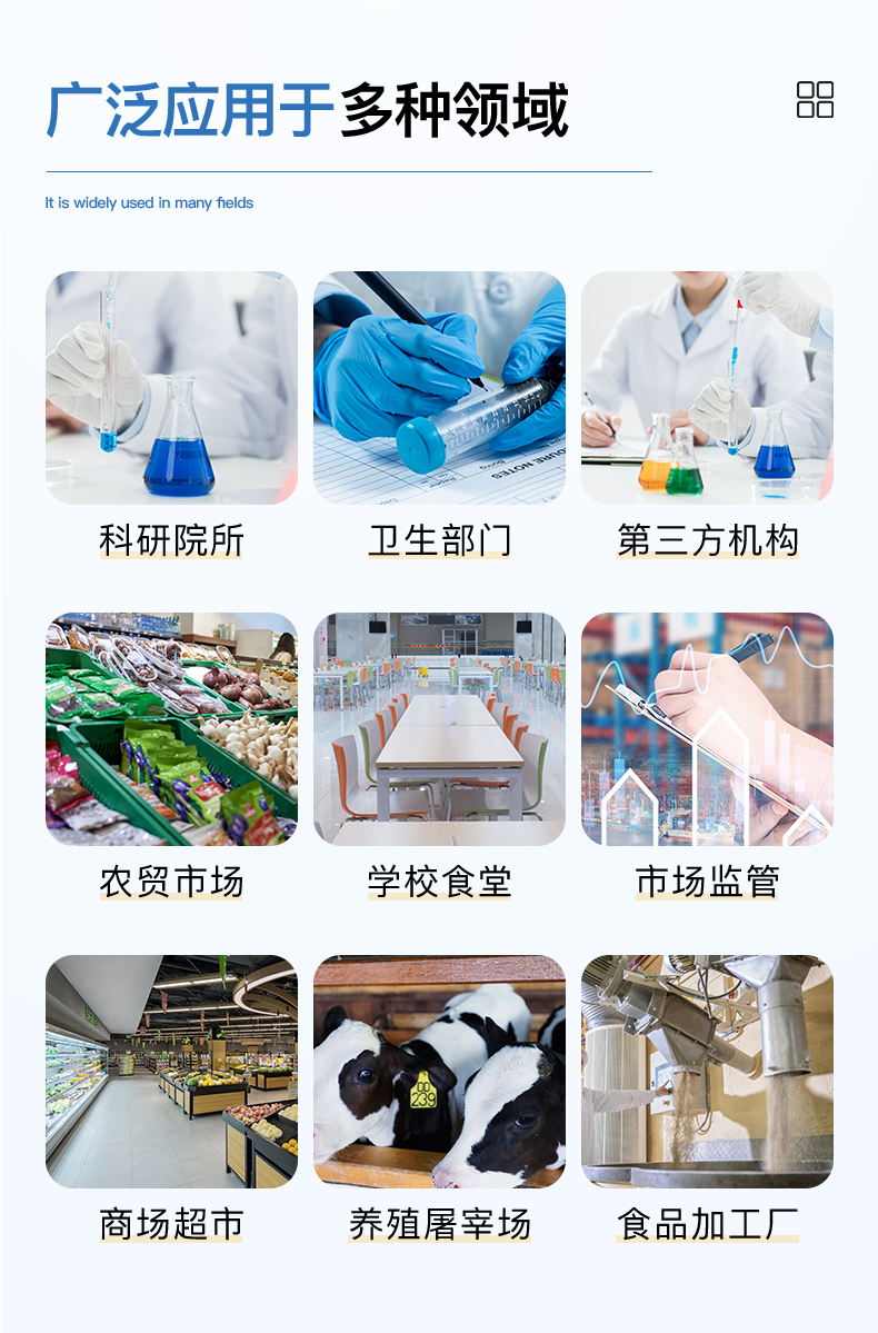 3、瓜果蔬菜藥殘:農(nóng)藥殘留(酶抑制率法)、多菌靈、百菌清、毒死蜱、克百威、啶蟲(chóng)脒、甲萘威、甲氰菊酯、異丙威、氟蟲(chóng)腈、聯(lián)苯菊酯、阿維菌素、噻蟲(chóng)嗪、吡蟲(chóng)啉、殺螟硫磷、百草枯、無(wú)根水(豆芽)、6-芐氨基嘌呤(豆芽)等;