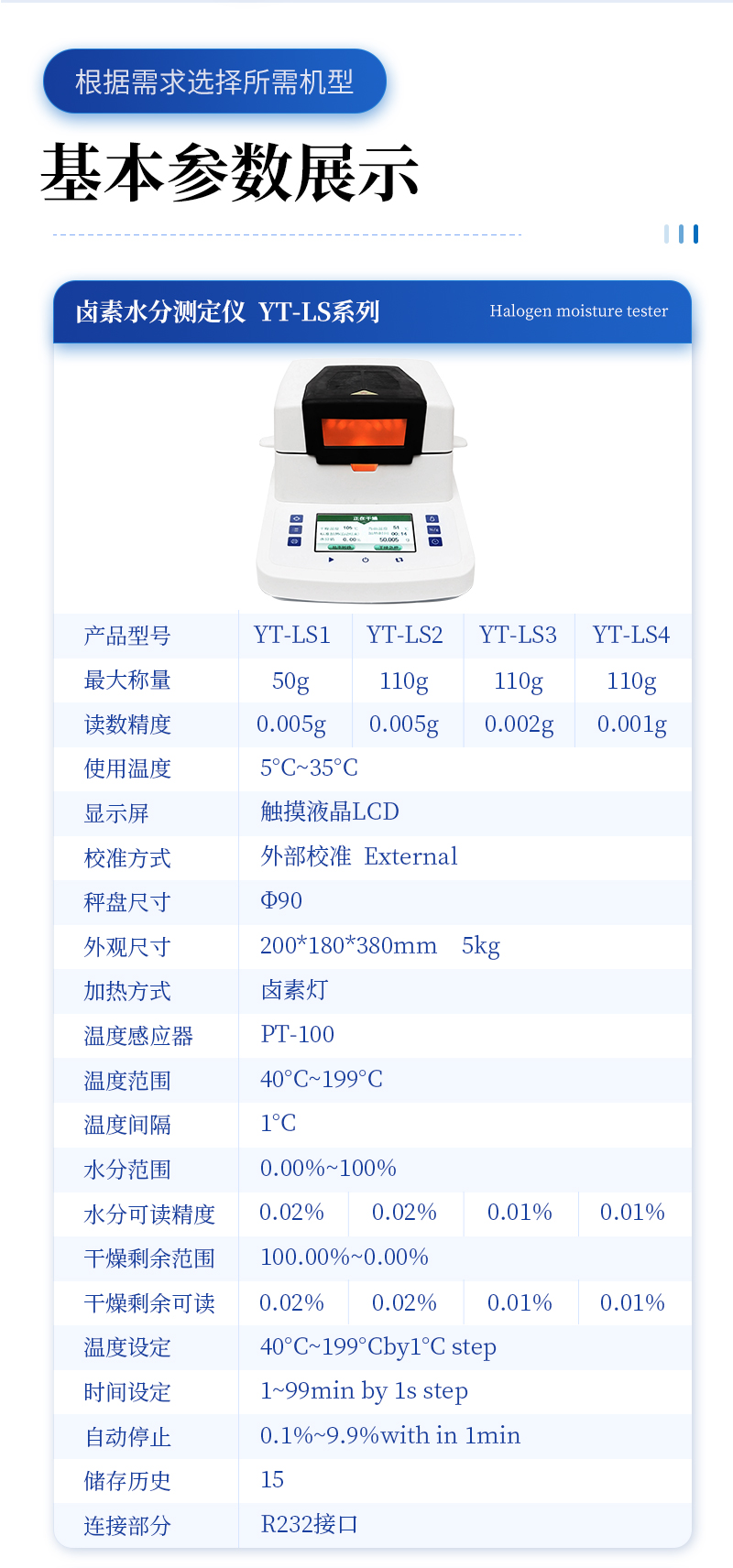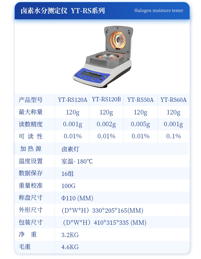 | 水分可讀精度 Moisturereadability | 0.02% | 0.02% | 0.01% | 0.01% |