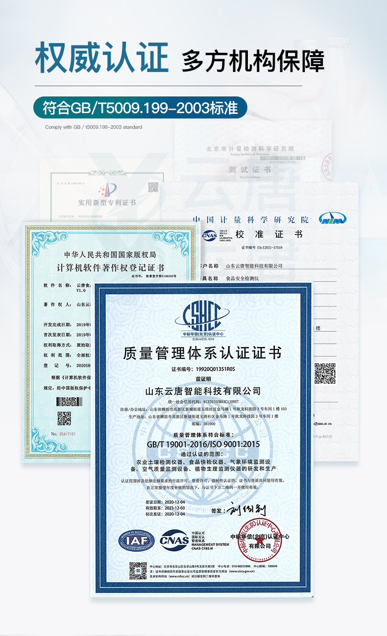 山東云唐智能科技有限公司生產的食品安全綜合分析儀為集成化食品安全快速檢測分析設備,采用臺式一體化設計,可快速檢測200多種食品安全項目,包含非食用化學物質、濫用食品添加劑、農藥殘留、獸藥殘留、重金屬、病害肉、營養強化劑、抗生素類殘留、激素類殘留、真菌毒素類殘留、化學類殘留等項目的定性定量檢測。