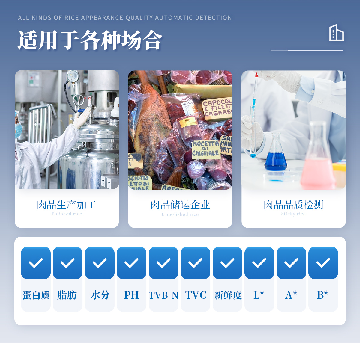 可用于檢測(cè)生鮮肉的蛋白質(zhì)、脂肪、水分、pH、TVC、TVB-N、新鮮度、L*、A*、B*等品質(zhì)參數(shù)。配備手提箱式防水減震外殼、大尺寸觸控屏幕并內(nèi)置大容量電池,可一鍵自動(dòng)校準(zhǔn),是一款適合移動(dòng)作業(yè)場(chǎng)景的高精度生鮮肉品質(zhì)檢測(cè)儀,其可用于生鮮肉及肉品生產(chǎn)、加工、儲(chǔ)運(yùn)企業(yè)、肉品品質(zhì)監(jiān)管部門等。