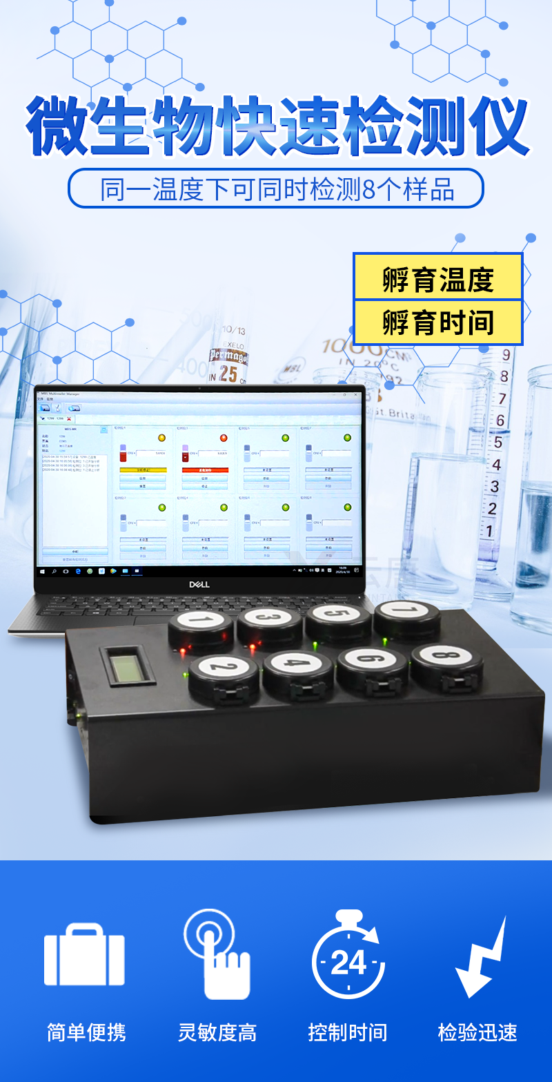 | 1.每種微生物快速檢測試劑瓶檢測不同微生物,試劑瓶內含有針對特定微生物類的氧化還原酶。當被微生物污染的樣品插入試劑瓶后,氧化還原酶會發生化學反應,導致瓶中液體的顏色發生變化,液體顏色會根據瓶中微生物的數量發生變化。 | 2.含樣品的試劑瓶可放置在30oC,37oC或44oC的小型細菌培養箱中,或放置在MBS微生物快速檢測儀中進行 | 3. MBS微生物快速檢測儀,可同時對8個試劑瓶(八份不同菌種樣品)獨立地檢測,分別控制溫度,并分別給出定量分析報告。分析報告通過單獨安裝的軟件進行讀取,軟件適合系統包括:Windows XP、Vista | 4.使用后,按壓容器口將氯基溶液添加到容器內以此殺菌,容器內微物幾分鐘可殺死達到消毒目的。 |